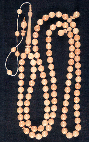 10 mm çapında taneli, fildişi (imame, duraklar ve tepelikte "Allah-Muhammed"; taneler üzerine altın çivilerle "Sübhanallah" "Elhamdülillah" yazılmış, tespihin tamamında 8500 altın çivi kakma yapılarak kullanılmıştır.)